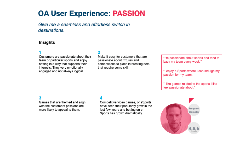 There was an opportunity to take the customer on a journey from ‘skill-based’ and ‘passion’ motivated sports betting to experiences in gaming that aligned with the user’s interests and behaviours to deliver content that was relevant and salient.